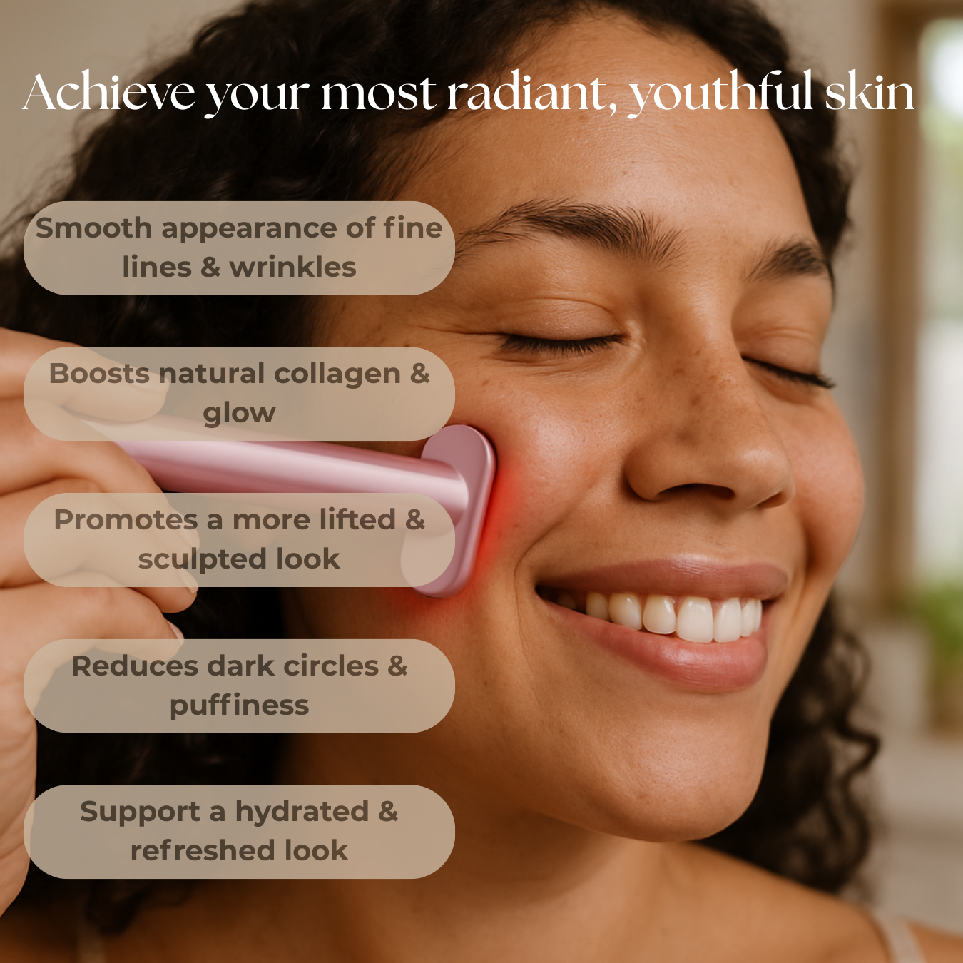 Experience an immediate, youthful radiance that turns heads. The red light and serum work together to visibly brighten your skin, giving you that fresh, 'just woke up like this' luminosity.